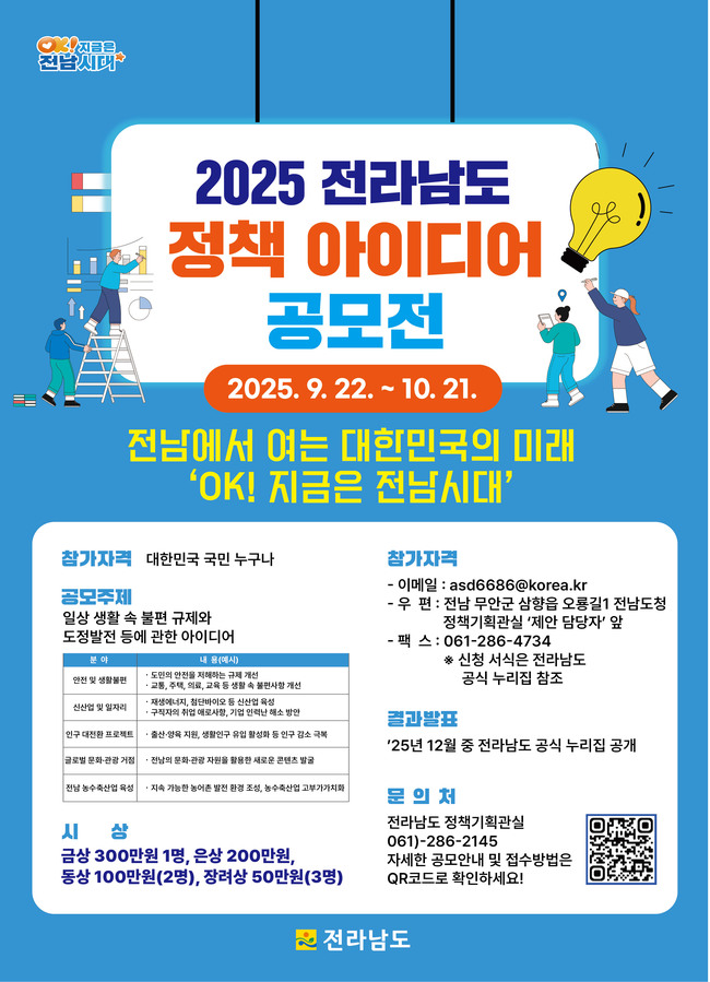전라남도가 새 정부의 실용주의 기조에 맞춰 ‘생활 속 불편을 찾고 이를 개선할, 지역의 미래를 먹여 살릴 정책’을 주제로 ‘2025년 전라남도 정책 아이디어 공모전’을 개최한다.