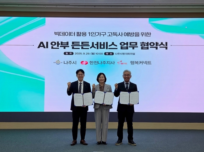 나주시는 최근 한국전력공사 나주지사, SK재단법인 행복커넥트와 함께 1인 가구 사회안전망 강화를 위한 ‘AI안부 든든서비스’ 3자 업무협약을 체결하며 민관공이 함께하는 통합형 사회안전망 구축에 나섰다고 밝혔다.