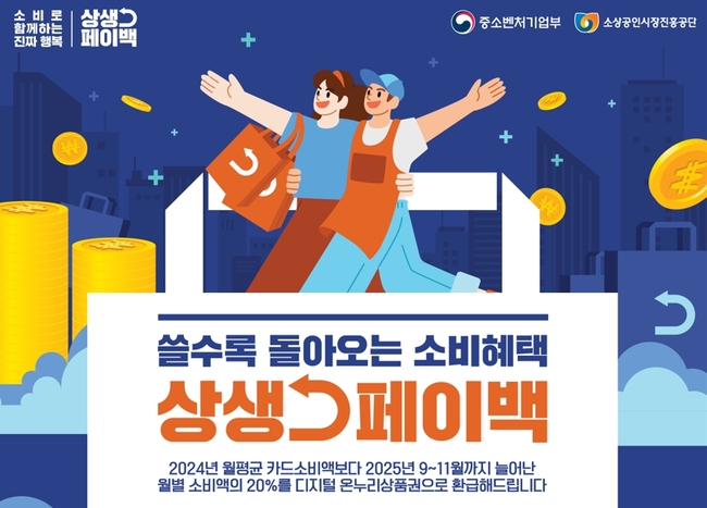 상생페이백은 만 19세 이상 국민과 외국인을 대상으로, 올해 9월부터 11월까지 월별 카드 사용액이 지난해 본인 월평균 소비액보다 증가할 경우, 증가분의 20%를 디지털 온누리상품권으로 환급해 주는 사업이다.