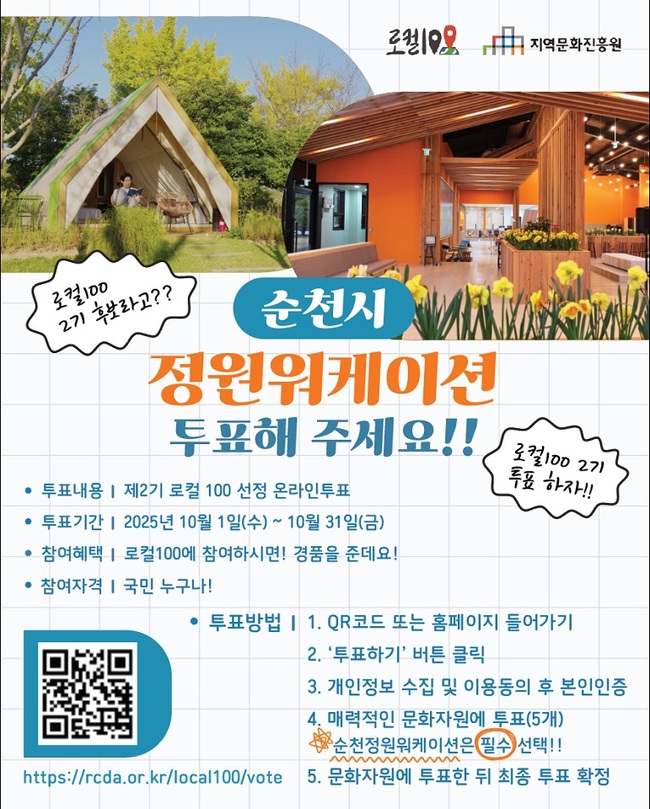 시 관계자는 “올해 총 1,042곳의 추천지 중 빅데이터 분석과 지역 심사를 통해 200개의 후보군이 선정됐는데, 그중 순천 정원워케이션이 이름을 올렸다”며, “독창적인 매력을 인정받아 매우 뜻깊게 생각한다. 제2기 로컬 100에 선정될 수 있도록 많은 관심과 응원 부탁드린다”고 말했다.