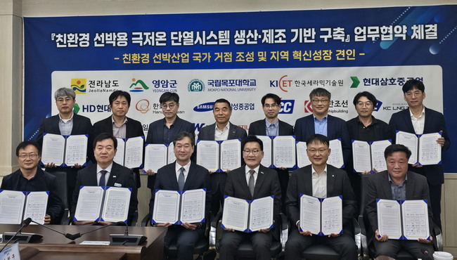 전라남도는 지난 6일 조선·해양 분야 최고의 전문성과 기술력을 보유한 대학, 연구 기관, 기업들과 친환경 선박용 극저온 단열시스템 생산·제조 기반 구축 업무협약을 목포대학교에서 체결했다고 밝혔다.
