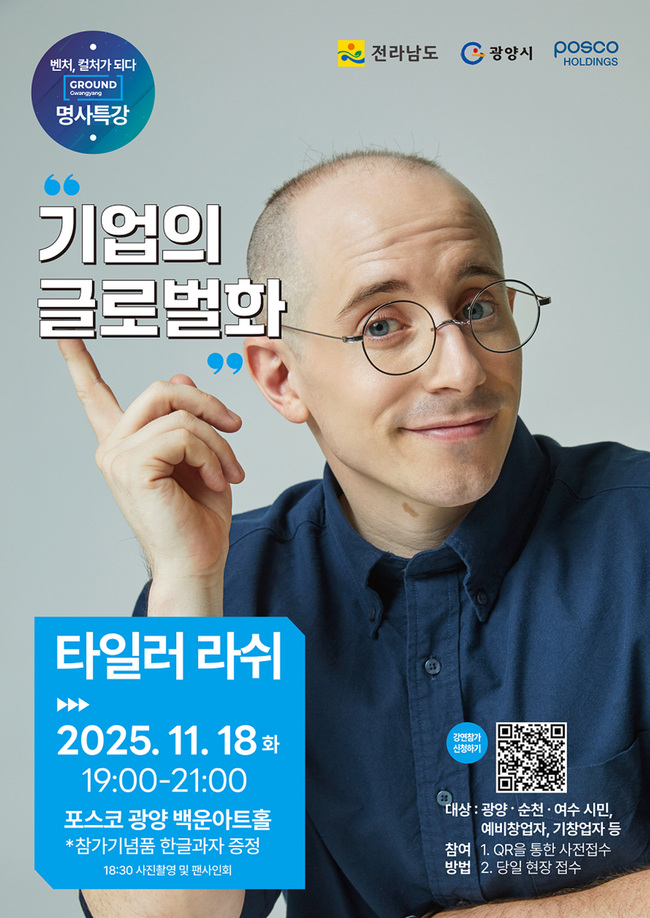 광양시는 오는 18일 오후 7시 백운아트홀에서 열리는 ‘2025년 제3회 광양 스타트업 콘서트’에 방송인 타일러 라쉬를 초청해 글로벌 특강을 진행한다.