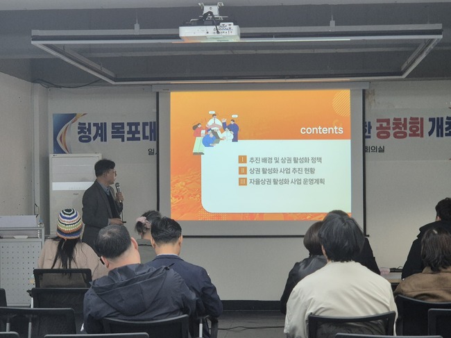 무안군은 청계면 목대 후문 상권 내 도시재생센터 회의실에서 청계 목대 후문 자율상권 지정을 위한 주민공청회를 개최했다고 13일 밝혔다.