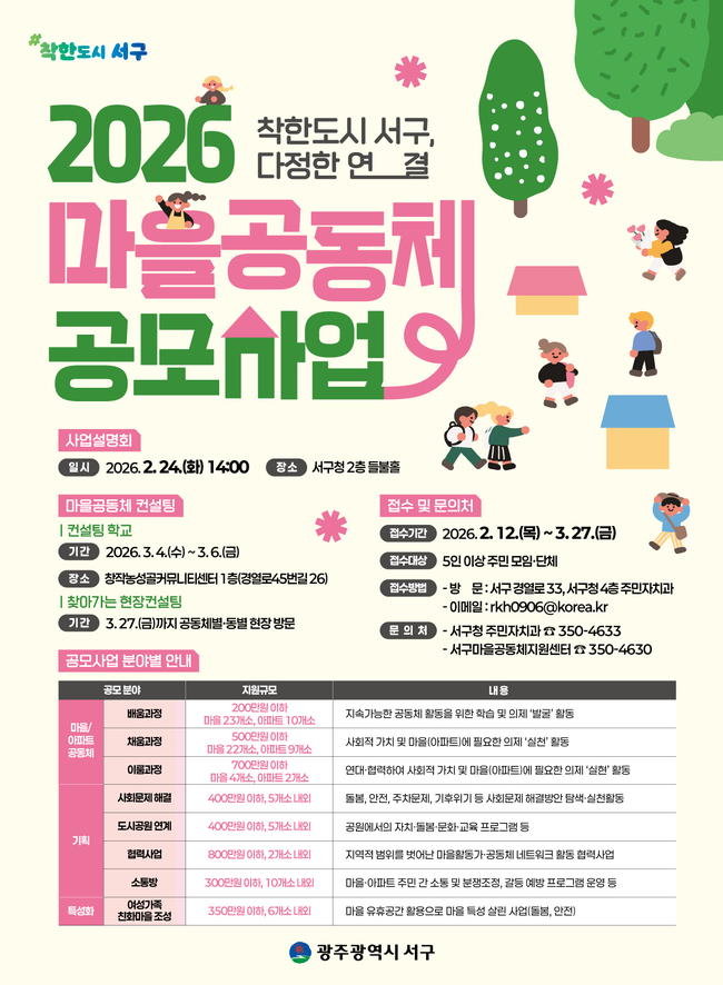 서구는 연대와 지원을 기반으로 따뜻한 마을생태계를 조성하기 위해 3억6000만원 규모의 ‘2026년 주민주도 마을공동체 공모사업’을 본격 추진한다.