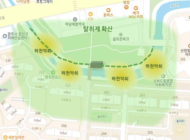이에 광산구는 악취 해결을 위해 장수천 보도교 하부에 위치한 토구에 악취차단수문 1개소를 설치해 토구에서 배출되는 근본적인 복합악취를 차단하고, 장수천 산책로를 따라 대기편승 악취저감시설 1개소도 설치해 대기 중에 노출된 악취 농도를 줄일 계획이다.