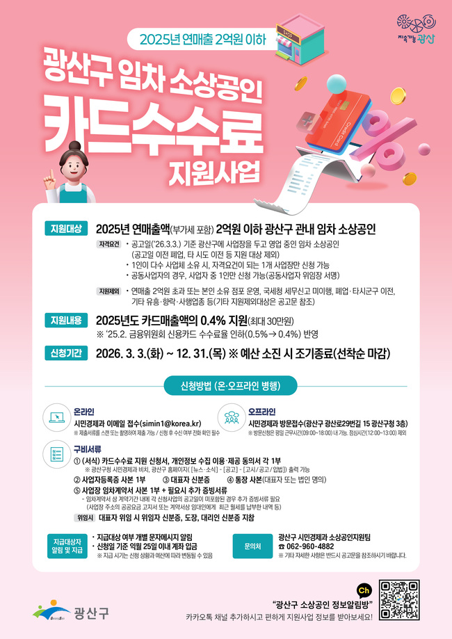 지원 대상은 지난해 연 매출액(부가세 포함) 2억 원 이하의 광산구 내 임차 소상공인을 대상으로 지난해 카드 매출액의 0.4%로 최대 30만 원까지 지원한다.