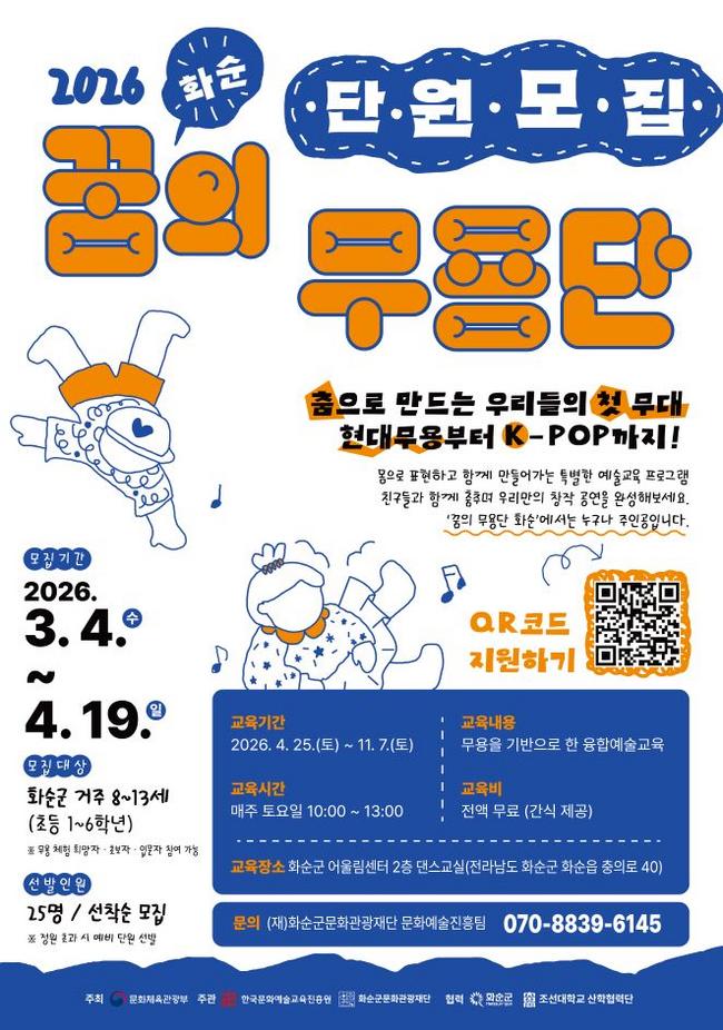 (재)화순군문화관광재단은 오는 4월 19일까지 ‘2026 꿈의 무용단 화순’ 3기 단원을 모집한다고 18일 밝혔다.