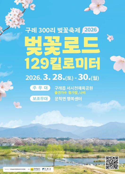 구례군이 전국 최장 129㎞ 벚꽃길을 앞세운 ‘2026 구례300리 벚꽃축제’를 오는 3월 28일부터 30일까지 3일간 서시천체육공원과 문척면 행복센터 일원에서 개최한다.