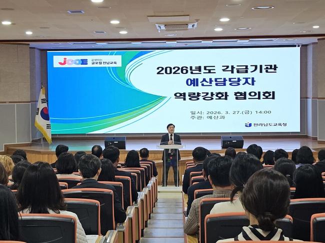 전라남도교육청이 27일 전남교육청교육연구정보원에서 ‘2026년 예산업무 담당자 역량강화 협의회’를 열어, 상반기 신속집행 추진과 재정 운영 전략을 공유했다.