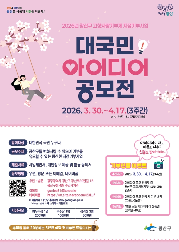 광산구가 ‘2026년 광산구 고향사랑기부제 지정기부사업 대국민 아이디어 공모’를 오는 4월 17일까지 진행한다.
