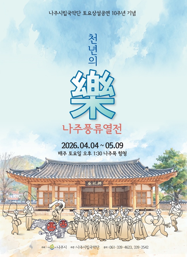 나주시가 오는 4일부터 5월 9일까지 매주 토요일 나주목 향청에서 나주시립국악단 토요상설공연 ‘천년의 樂 나주풍류열전’을 개최한다고 밝혔다.