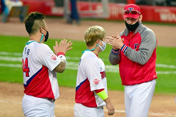 7일 오후 광주 북구 광주-기아챔피언스필드에서 열린 2020프로야구 KIA 타이거즈 대 한화 이글스의 더블헤더 1경기, KIA 윌리엄스 감독이 홈런을 친 최형우, 김선빈에게 박수를 치고 있다.