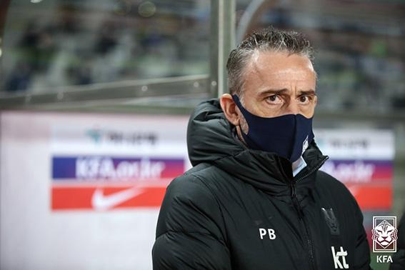 12일 오후 경기 고양시 고양종합운동장에서 열린 축구 국가대표팀과 올림픽대표팀의 친선경기 2차전, 국가대표팀 파울루 벤투 감독이 마스크를 착용하고 있다. (사진= 대한축구협회 제공)