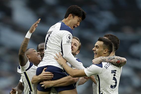 손흥민이 18일(현지시간) 영국 런던의 토트넘 홋스퍼 스타디움에서 열린 2020-21 시즌 프리미어리그(EPL) 5라운드 웨스트햄과 경기에 선발 출전해 선제골을 넣고 동료들과 기뻐하고 있다. 손흥민은 경기 시작 45초 만에 해리 케인의 도움을 받아 리그 7호 골을 넣었고 이어 해리 케인의 골에 리그 2호 도움을 기록했다. 토트넘은 후반 세 골을 허용하며 3-3으로 비겼다.