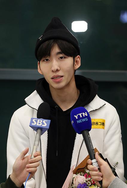 쇼트트랙 국가대표 임효준 선수가 불가리아 소피아에서 열린 2018-2019 국제빙상경기연맹(ISU) 쇼트트랙 세계선수권대회를 마치고 12일 오후 인천국제공항 제1터미널을 통해 귀국, 취재진의 질문에 답하고 있다