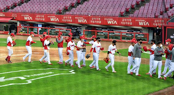 광주 북구 광주-기아챔피언스필드에서 열린 2020프로야구 KIA 타이거즈 대 한화 이글스의 더블헤더 1경기, KIA가 6-4 승리를 거둔 뒤 하이파이브 하고 있다.