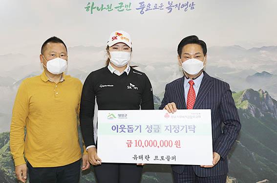 영암군에 따르면 지난해 2020 KLPGA 대상 신인왕을 수상한 영암출신 유해란 프로골퍼가 재작년 영암군 인재육성장학재단 장학금 2000만원 기탁에 이어 이번에는 지역의 어려운 이웃들에게 지원해달라고 고향사랑 성금 1000만원을 지정기탁하여 온정과 나눔 문화 확산에 크게 기여하고 있다.
