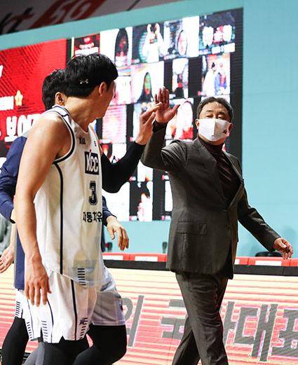 10연승을 거둔 경기에서 전 감독의 용병술이 빛났다. 82-83으로 뒤진 4쿼터 종료 9.7초를 남기고 마지막 공격 기회에서 코트에 있던 라건아를 대신해 데이비스를 투입했고, 데이비스는 결승점으로 화답했다.