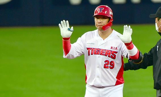 20일 오후 광주 북구 광주-기아챔피언스필드에서 열린 2020프로야구 KIA 타이거즈 대 롯데 자이언츠 경기, 3회말 무사 1, 2루에서 KIA 5번타자 나지완이 2타점 2루타를 친 뒤 2루에서 타임을 요청하고 있다. 2020.05.20.