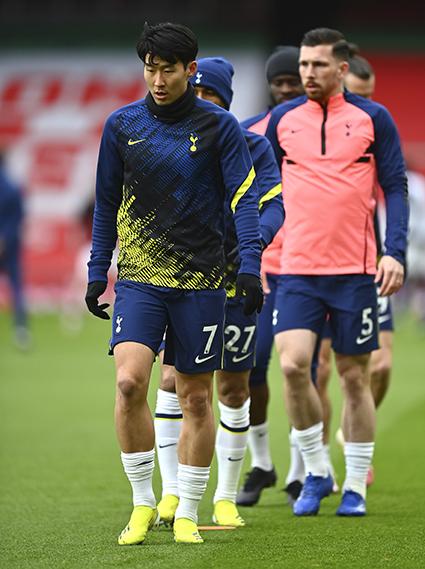 손흥민이 14일(현지시간) 영국 런던의 에미레이츠 스타디움에서 열린 아스널과 2020-2021 잉글랜드 프로축구 프리미어리그(EPL) 28라운드 경기를 앞두고 몸을 풀고 있다. 손흥민은 경기 중 허벅지 근육 부상으로 전반 19분 에리크 라멜라와 교체됐고 토트넘은 1-2로 역전패 했다. 2021.03.15.