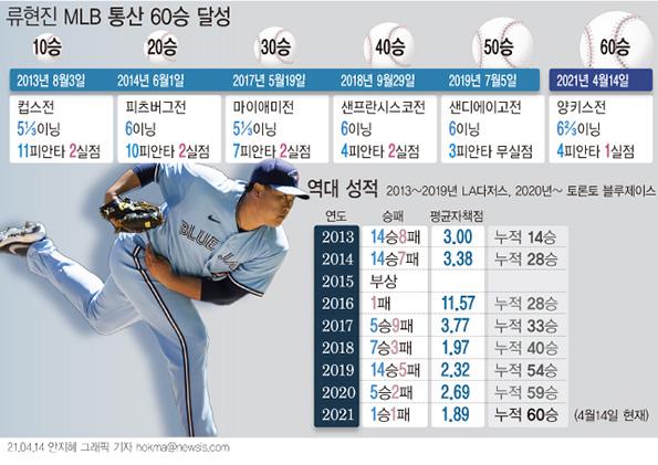 류현진은 올해 힘겹게 첫 승을 신고했지만, 빅리그 통산 60승 고지를 밟았다. 올해 경기 결과에 따라 통산 70승도 충분히 가능하다.