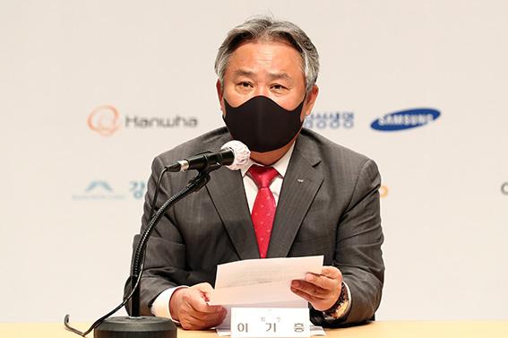 이기흥 대한체육회장이 14일 오후 충북 진천군 진천 국가대표 선수촌 챔피언하우스에서 열린 도쿄 하계 올림픽대회 G-100 미디어데이 대한민국선수단 합동기자회견에 참석해 인사말을 하고 있다. 2021.04.14.