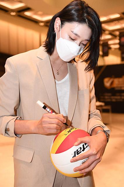 김연경 흥국생명 핑크스파이더스 선수가 19일 오후 서울 용산구 그랜드 하얏트 서울에서 열린 2020-2021 도드람 V-리그 시상식에 참석해 배구공에 사인을 하고 있다. (사진=한국배구연맹 제공) 2021.04.19