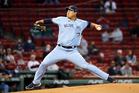토론토 블루제이스 류현진이 20일(현지시간) 미 매사추세츠주 보스턴의 펜웨이 파크에서 열린 2021 메이저리그(MLB) 보스턴 레드삭스와의 경기에 선발 등판해 1회 투구하고 있다. 2021.04.21.