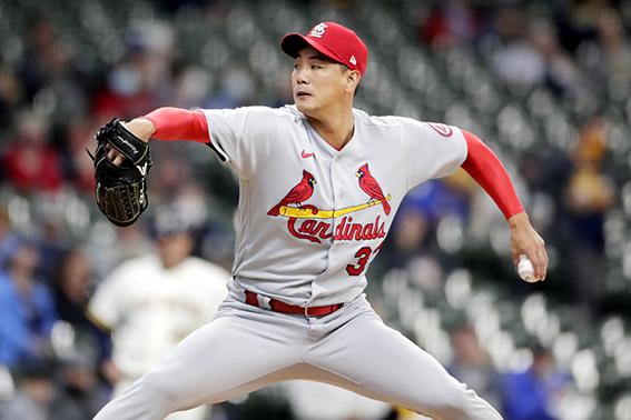 세인트루이스 카디널스 김광현이 11일(현지시간) 미 위스콘신주 밀워키의 아메리칸 패밀리필드에서 열린 2021 메이저리그 밀워키 브루어스와의 경기에 선발 등판해 1회 투구하고 있다. 2021.05.12.