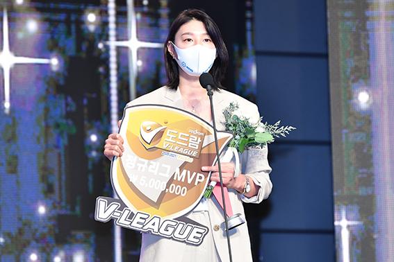 흥국생명 김연경이 19일 오후 서울 용산구 그랜드 하얏트 서울에서 열린 2020-2021 도드람 V-리그 시상식에 참석해 조원태 한국배구연맹 총재로부터 정규리그 MVP 트로피를 받은 뒤 소감을 말하고 있다.(사진=한국배구연맹 제공) 2021.04.19.