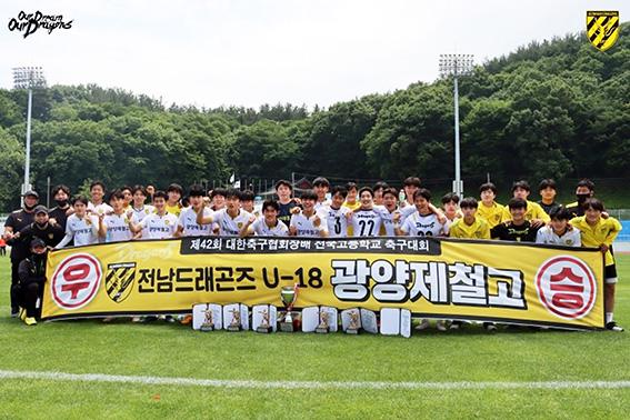 전남드래곤즈 U-18 광양제철고가 지난 28일 남해공설운동장에서 열린 제42회 대한축구협회장배 전국고등학교 축구대회 결승전에서 후반 25분 터진 문승민의 결승골로 전북현대모터스 U-18 영생고를 1-0으로 꺾고 우승을 차지했다. 특히 이번 대회는 K리그 산하 22개 유소년 팀들이 출전하는 대회인 만큼 다시 한번 K리그 유스 최강자로 우뚝서는 쾌거를 이뤘다.