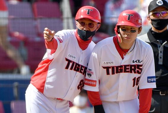 30일 오후 광주 북구 광주-기아챔피언스필드에서 열린 2021프로야구 KIA 타이거즈 대 KT 위즈의 경기, 6회말 2사 1, 3루에서 KIA 3루주자 최원준이 정성훈 코치로부터 작전지시를 받고 있다. 2021.05.30.