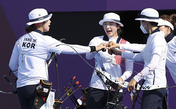 강채영(25·현대모비스), 장민희(22·인천대), 안산(20·광주여대)으로 구성된 여자 양궁대표팀은 25일 오후 일본 도쿄의 유네노시마 양궁장에서 2020 도쿄올림픽 양궁 여자 단체전 결승전에서 러시아올림픽위원회(ROC)를 세트 점수 6-0(55-54 56-53 54-51)으로 승리하며 금메달을 목에 걸었다.
