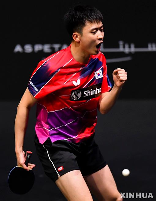 정영식(13위)이 10일(현지시간) 카타르 도하에서 열린 2021 WTT 스타 컨텐더 도하 남자 단식 16강전 츠보이 구스타보(36위·브라질)와 경기하고 있다. 정영식은 구스타보에 세트 스코어 3-1(6-11 11-5 11-9 11-3) 역전승을 거두고 8강에 진출했다. 2021.03.11.