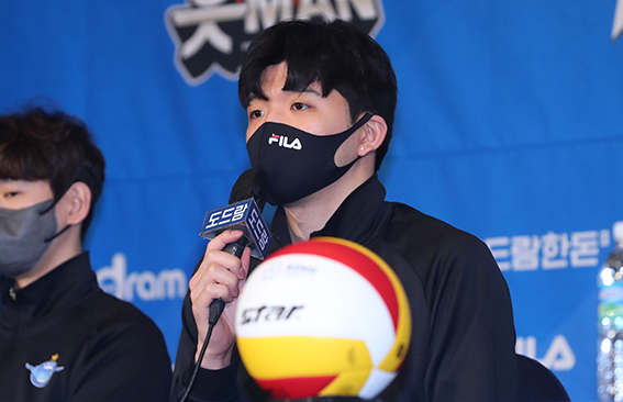 도드람 2020~2021 V-리그 남자부 포스트시즌 미디어데이가 열린 3일 오전 서울 서대문구 스위스 그랜드 호텔에서 대한항공 정지석이 취재진의 질문에 답하고 있다. 2021.04.03.