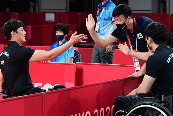 2일 일본 도쿄 메트로폴리탄 체육관에서 열린 2020 도쿄패럴림픽 탁구 남자 단체전(스포츠 등급4-5) 대한민국과 중국의 결승전에서 중국이 2대0으로 승리했다. 최선을 다한 한국 선수들이 경기 후 서로를 격려하고 있다. 2021.09.02.