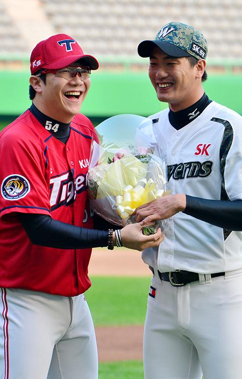 2015년 9월21일 당시 KIA 타이거즈 양현종(왼쪽)이 개인통산 1000탈삼진을 기록한 SK 와이번스(현 SSG 랜더스) 김광현에게 축하 꽃다발을 전달하고 있다.