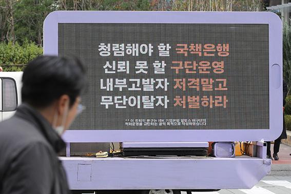 24일 오후 서울 중구 IBK기업은행 본사 앞에서 IBK기업은행 배구단을 규탄하는 트럭시위가 진행되고 있다. IBK기업은행 배구단 팬들은 트럭 시위를 통해 팀을 무단 이탈한 조송화 선수, 감독대행을 맡은 김사니 코치의 퇴출 등을 요구했다. 2021.11.24.