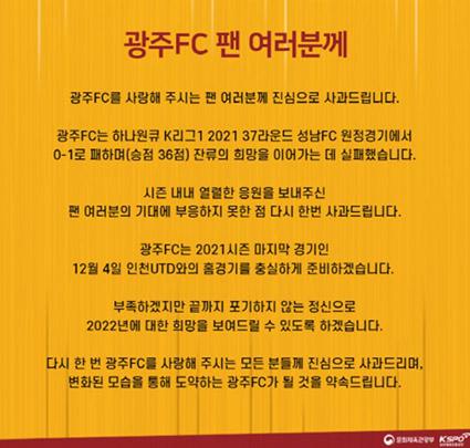 광주는 30일 구단 소셜네트워크서비스(SNS)를 통해 "광주를 사랑해 주시는 팬 여러분께 진심으로 사과드린다. 광주는 성남 원정에서 패하며 잔류의 희망을 이어가는 데 실패했다. 팬 여러분의 기대에 부응하지 못한 점 다시 한 번 사과드린다"고 했다.