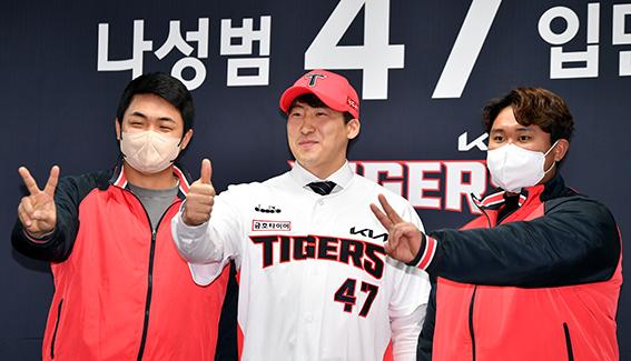 150억원 FA계약을 체결하고 프로야구 호랑이 구단 유니폼을 입은 나성범이 19일 "열두번째 우승을 첫번째 목표"로 제시했다. 나성범은 입단식에서 후배들과 나란히 'V12'를 상징하는 손가락 퍼포먼스를 보이기도 했다.