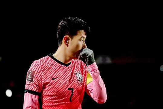 11일 오후 경기 고양시 고양종합운동장에서 열린 2022 FIFA 카타르 월드컵 아시아 지역 최종예선 대한민국과 UAE의 경기, 후반전 손흥민이 코를 만지고 있다. 2021.11.11.