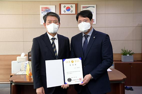 조인철 광주시 문화경제부시장이 27일 오전 시청 문화경제부시장실에서 안형승 시청 장애인직장운동부 양궁감독에게 임용장을 수여한 후 기념촬영을 하고 있다. /광주시 제공