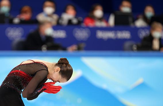 17일 오후 중국 베이징 캐피털 실내경기장에서 열린 2022 베이징동계올림픽 피겨 스케이팅 여자 싱글 프리스케이팅에서 금지약물(도핑) 적발에도 불구하고 출전한 러시아올림픽위원회(ROC) 카밀라 발리예바가 연기를 마친 뒤 울음을 터트리고 있다. 2022.02.17.