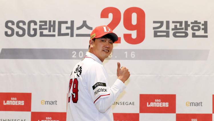 김광현은 민경삼 대표이사로부터 건네받은 등번호 \'29\'가 적힌 유니폼을 착용하고 포즈를 취했다. SK 와이번스 시절인 2019년까지 뛰다가 미국으로 건너갔으니 김광현이 SSG 유니폼을 입은 것은 이번이 처음이다.