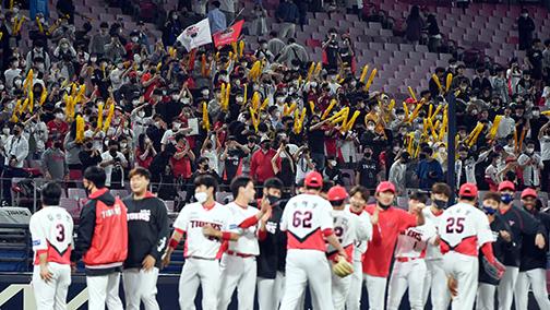 12일 오후 광주 북구 광주-기아챔피언스필드에서 열린 2022프로야구 KIA 타이거즈 대 롯데 자이언츠의 경기, KIA가 6-5 1점차 승리를 거둔 뒤 홈팬들 앞에서 하이파이브 하고 있다. 2022.04.12.