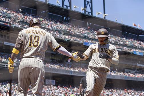샌디에이고 파드리스의 김하성(오른쪽)이 22일(현지시간) 미 캘리포니아주 샌프란시스코의 오라클 파크에서 열린 2022 메이저리그 샌프란시스코 자이언츠와의 경기 2회 안타를 치고 나간 후 득점하고 있다. 김하성은 5타수2안타1타점1득점을 기록하며 팀이 10-1로 앞선 가운데 경기를 이어가고 있다. 2022.05.23.