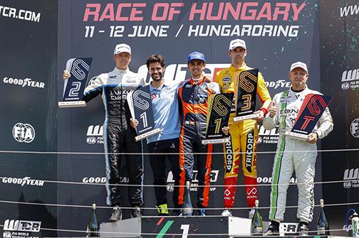 현대자동차는 ‘엘란트라 N TCR(국내명: 아반떼 N TCR)’이 지난 10일부터 12일(현지 시각)까지 헝가리 헝가로링(Hungaroring)에서 개최된 2022 WTCR 3라운드에서 우승을 차지했다고 13일(월) 밝혔다. 미켈 아즈코나(Mikel Azcona, BRC 현대 N 스쿼드라 코르세팀 소속, 가운데) 선수가 6월 10~12일 열린 ‘2022 WTCR’ 헝가리 대회에서 우승을 차지하고 포디움에 올라선 모습. /현대차 제공