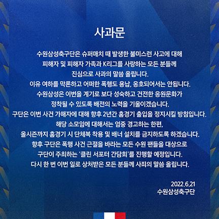 수원은 21일 구단 소셜네트워크서비스(SNS)를 통해 \"슈퍼매치 때 발생한 불미스러운 사고에 대해 피해자 및 피해자 가족과 K리그를 사랑하는 모든 분께 진심으로 사과의 말씀을 올린다\"며 \"이유 여하를 막론하고 어떠한 폭행도 용납, 옹호돼선 안 된다\"고 밝혔다.