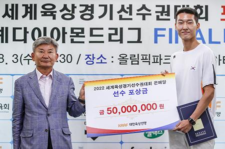 대한육상연맹은 서울 송파구 올림픽파크텔에서 \'2022 세계육상선수권대회 포상금 수여식 및 세계다이아몬드리그 파이널 시리즈 출정식\'을 개최하고 우상혁에게 포상금을 지급했다.