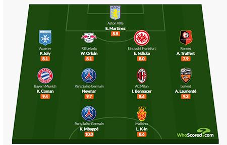 미드필더에는 네이마르(파리생제르맹·평점 9.7), 킹슬리 코망(바이에른뮌헨·평점 9.4), 이스마엘 베네세르(AC밀란·평점 8.6), 아르망 로리엔테(로리랑·평점 9.3)가 자리했다.